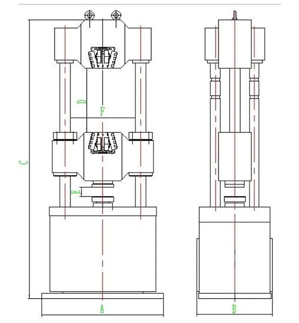 | Model | Overall dimension AxBxC,mm | Max. tensile space D,mm | Max. compression space E,mm | Test width F,mm |
